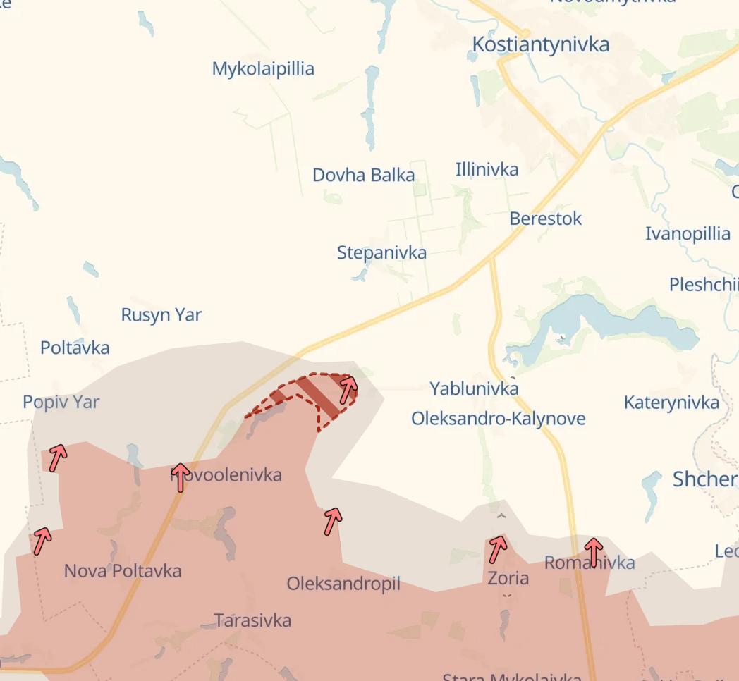 Також війська РФ просунулися в Яблонівці на південь від Костянтинівки. І в Кондрашівці на північ від Куп'янська.