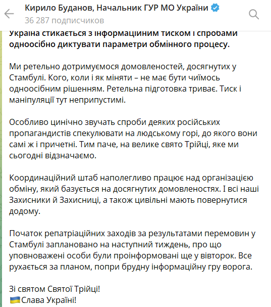 "Особливо цинічно звучать спроби деяких російських пропагандистів спекулювати на людському горі, до якого вони самі ж і причетні. Тим більше, на велике свято Трійці, яке ми сьогодні відзначаємо", - зазначив Буданов.
