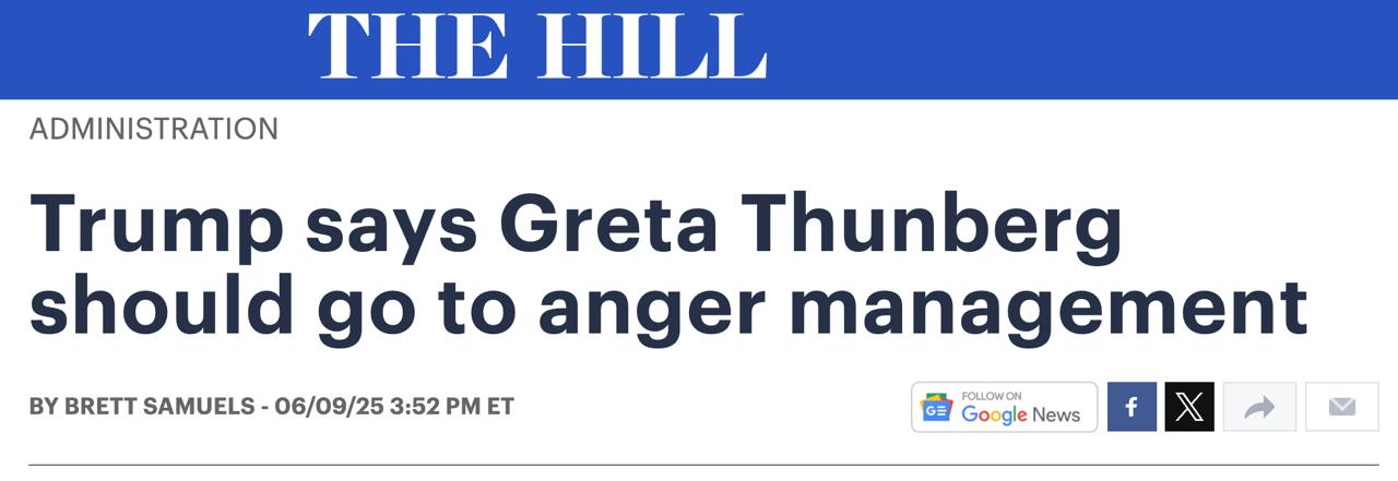 "Вона дивна людина. Вона молода, зла. Вона безперечно незвичайна. Я думаю, їй потрібно відвідувати курси з управління гнівом. Це моя головна рекомендація для неї", - заявив голова Білого дому на прохання журналістів прокоментувати затримання судна з активісткою біля берегів Гази.