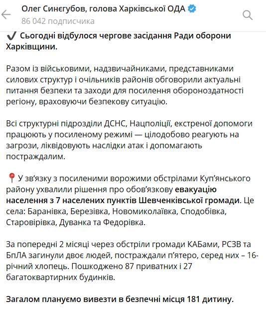 Враховуючи безпекову ситуацію в Куп'янському районі, під час засідання ради оборони Харківської області ухвалили рішення про обов'язкову евакуацію цивільних із семи населених пунктів Шевченківської громади. Це такі села: