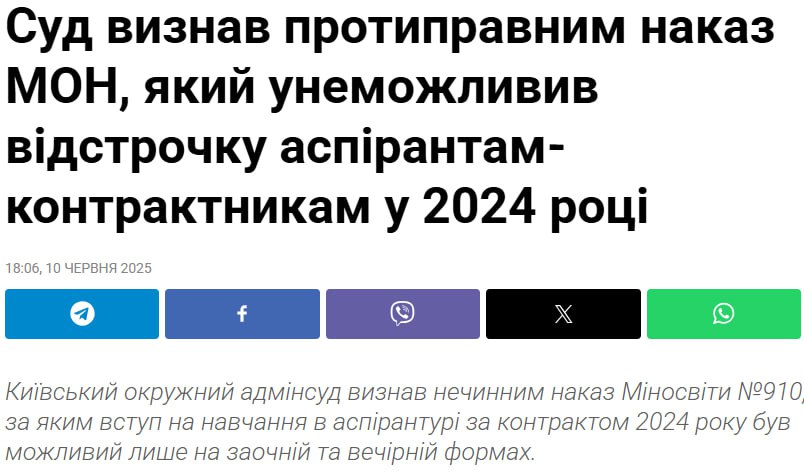 Суд визнав протиправним наказ Міністерства освіти і науки (МОН) України, який не дозволяв отримати відстрочку аспірантам-контрактникам у 2024 році.