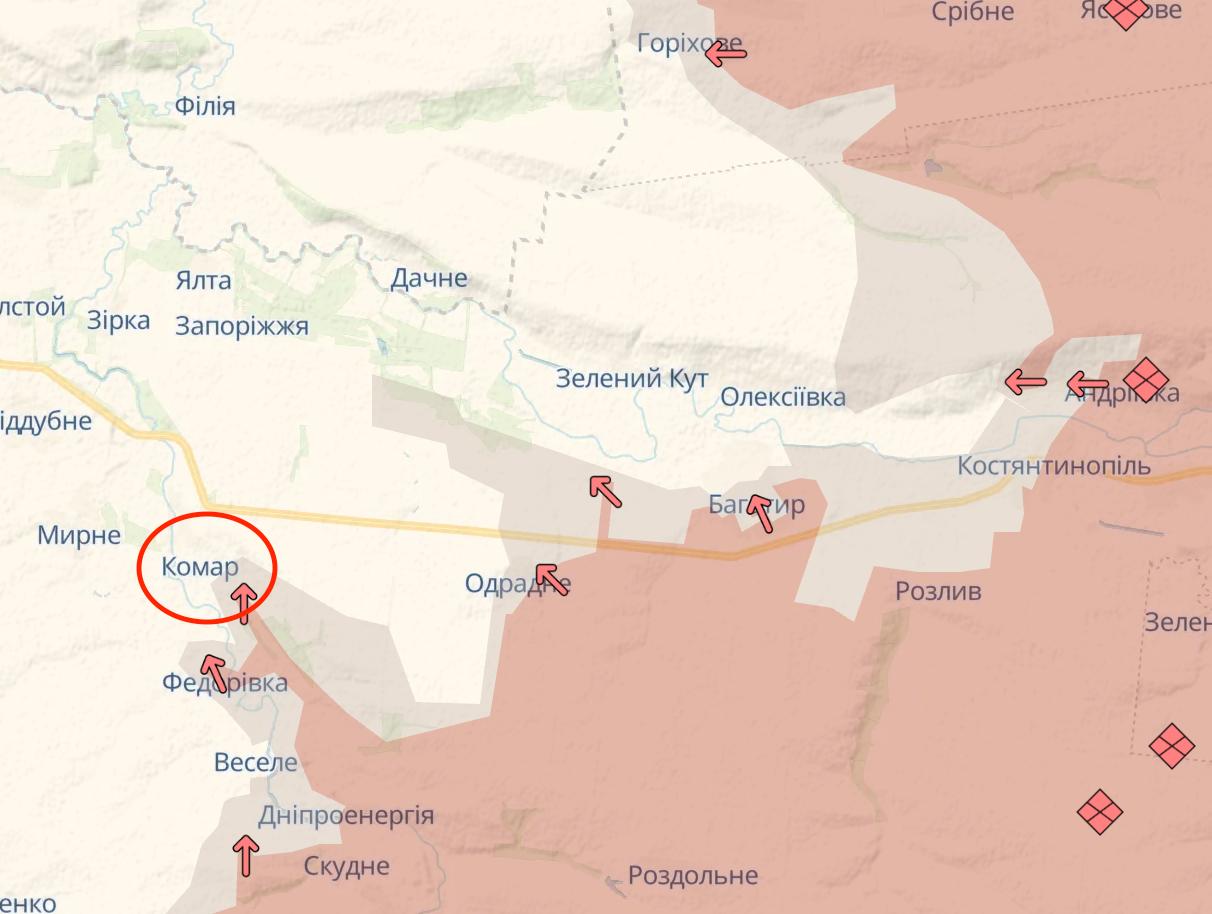 Міноборони Росії заявляє про захоплення тактично важливого села Комар біля основної траси на півдні Донецької області. Україна цього не підтверджувала. На карті Deep State вказано лише сіру зону на околиці села.