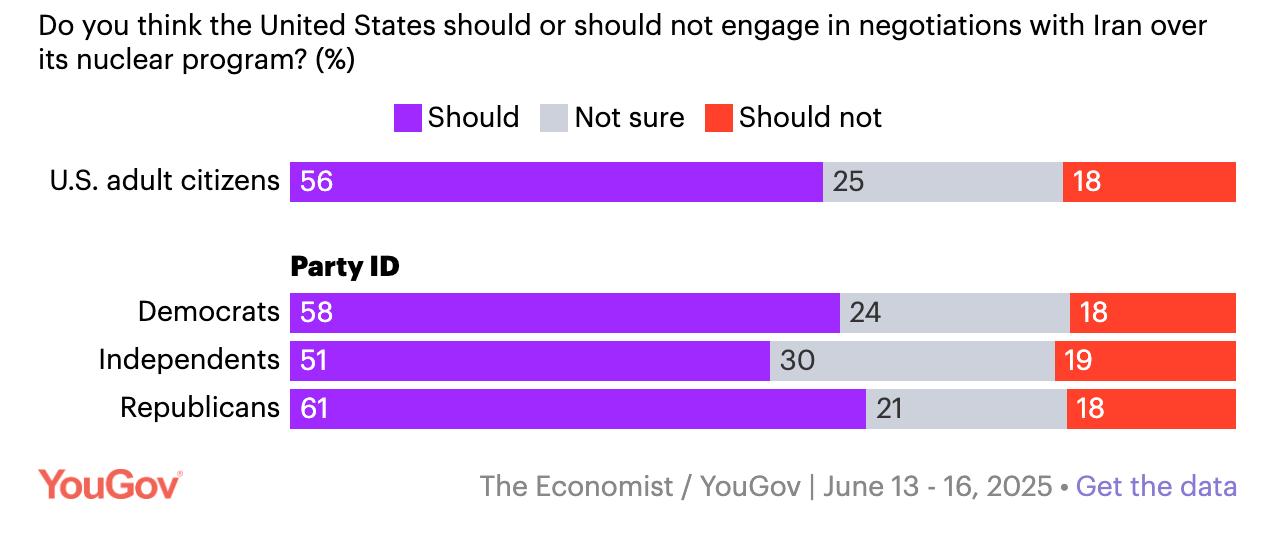 56% вважають, що США мають вести переговори з Іраном щодо його ядерної програми. Ця позиція отримала підтримку серед демократів (58%), і серед республіканців (61%). Незалежні виявилися менш однозначними, але й серед них більшість – 51% – виступають за переговори.
