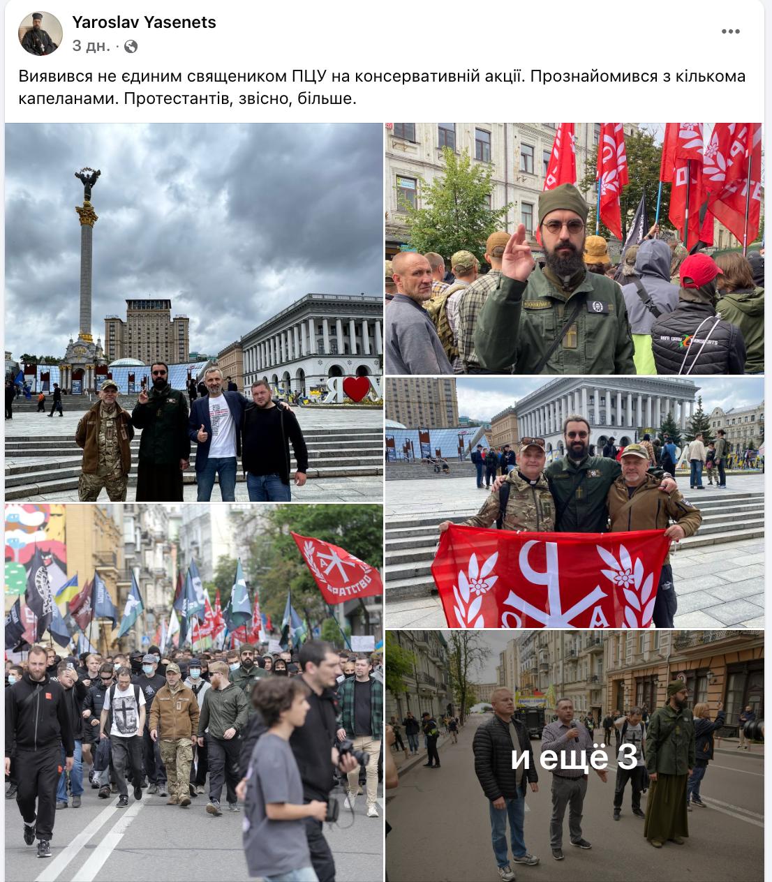 На своїй сторінці у Фейсбуці під фотографією зруйнованого ракетою будинку в Солом'янському районі священик написав: "Ось вам і марш "рівності"... Божа відплата - вона така".