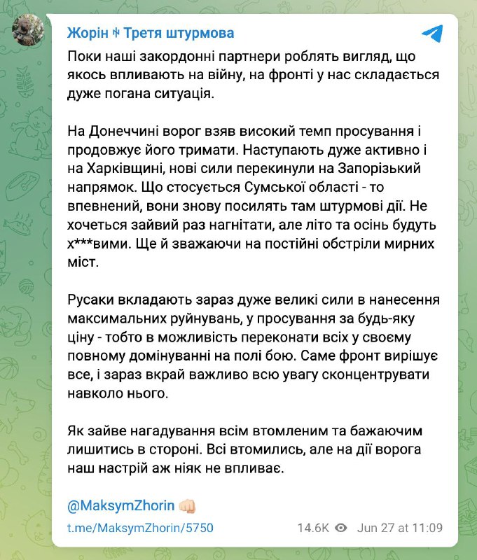 "Не хочеться зайвий раз нагнітати, але літо та осінь будуть х***вими. Ще й враховуючи постійні обстріли мирних міст", - пише Жорін.
