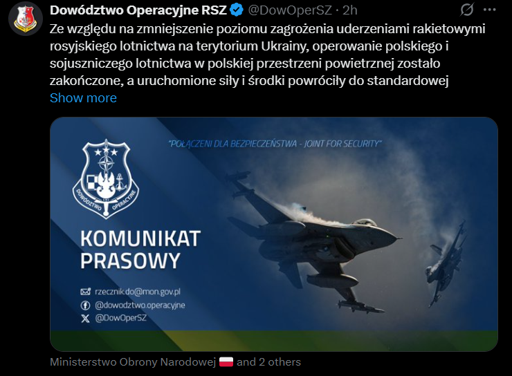 08:35 Вночі Польща піднімала винищувачі та приводила ППО у стан бойової готовності через масовану атаку РФ по Україні, повідомили в Оперативному командуванні ЗС Польщі.