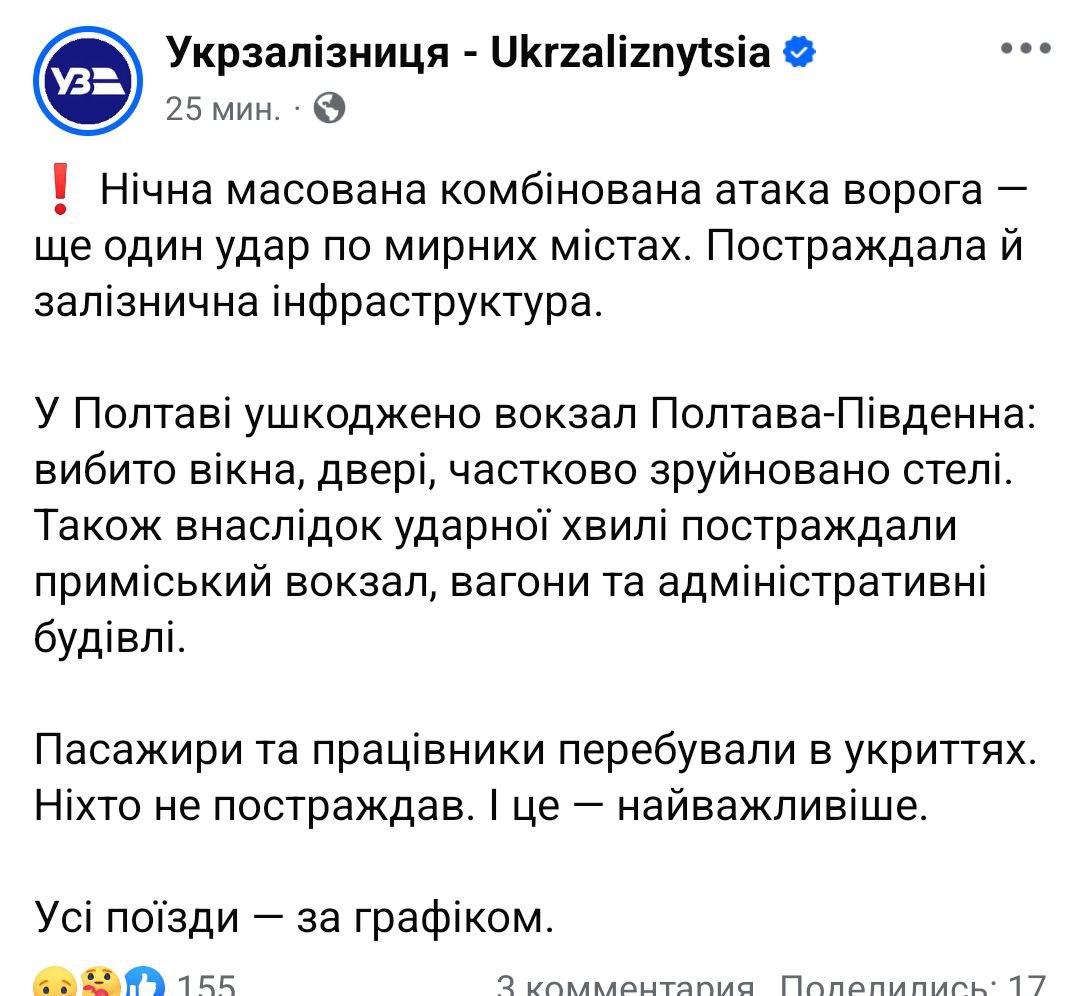 10:41 Внаслідок нічної масованої атаки постраждала залізнична інфраструктура у Полтаві, повідомляє "Укрзалізниця".