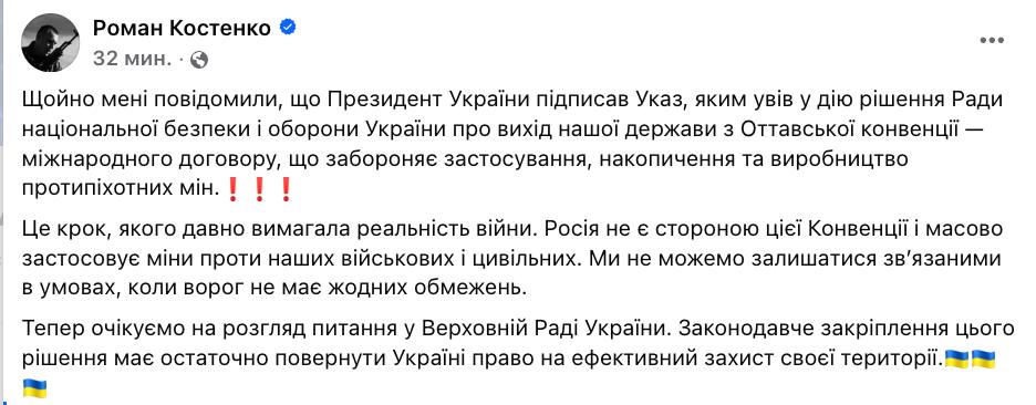 13:04 Президент Володимир Зеленський ввів у дію рішення РНБО про вихід із Оттавської конвенції, яка забороняє виробництво та застосування протипіхотних мін.