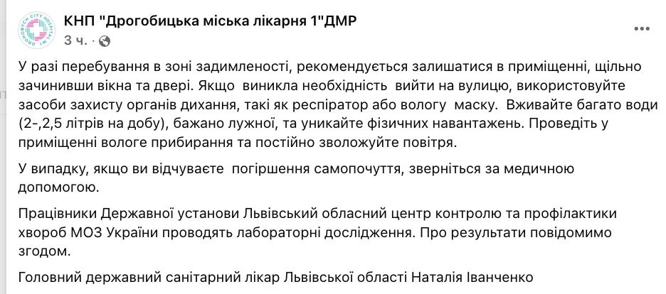 13:09 У Дрогобичі радять закривати вікна та не виходити на вулицю через дим після прильотів.