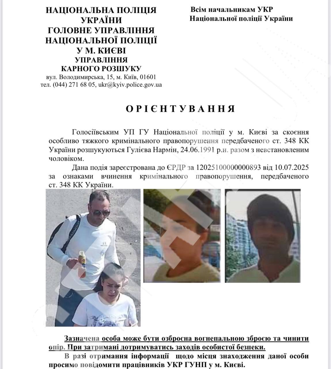 У розпорядженні "Країни" виявилося орієнтування на підозрюваних у вбивстві. Йдеться про Нармін Гулієвої, 1991 року народження, та її невідомого спільника. За даними поліції, підозрювані можуть бути озброєні та готові до опору. В орієнтуванні прямо зазначено: при затриманні дотримуватись заходів особистої безпеки.