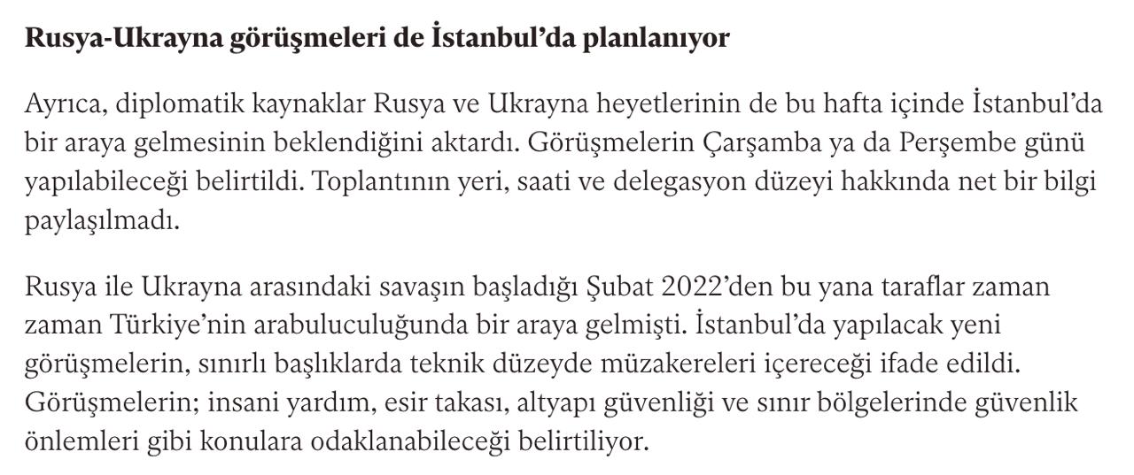 "За даними дипломатичних джерел, цього тижня у Стамбулі відбудуться важливі міжнародні дипломатичні зустрічі. Крім переговорів з європейськими країнами щодо ядерної програми Ірану, цього тижня у Стамбулі також очікуються переговори між Росією та Україною", - йдеться у статті.