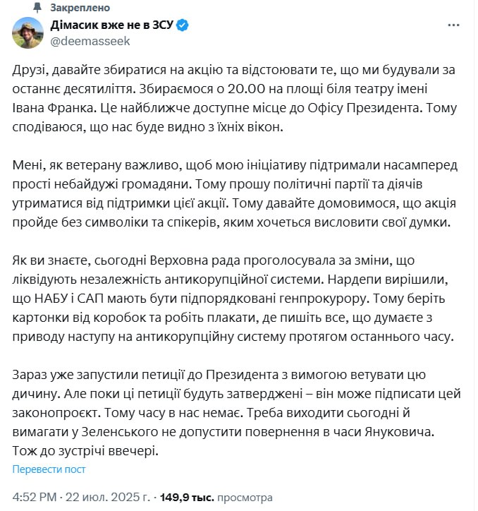 "Друзі, давайте збиратися на акцію та відстоювати те, що ми будували в останнє десятиліття. Збираємось о 20:00 на площі біля театру імені Івана Франка. Це найближче доступне місце біля Офісу президента", - написав колишній військовий.