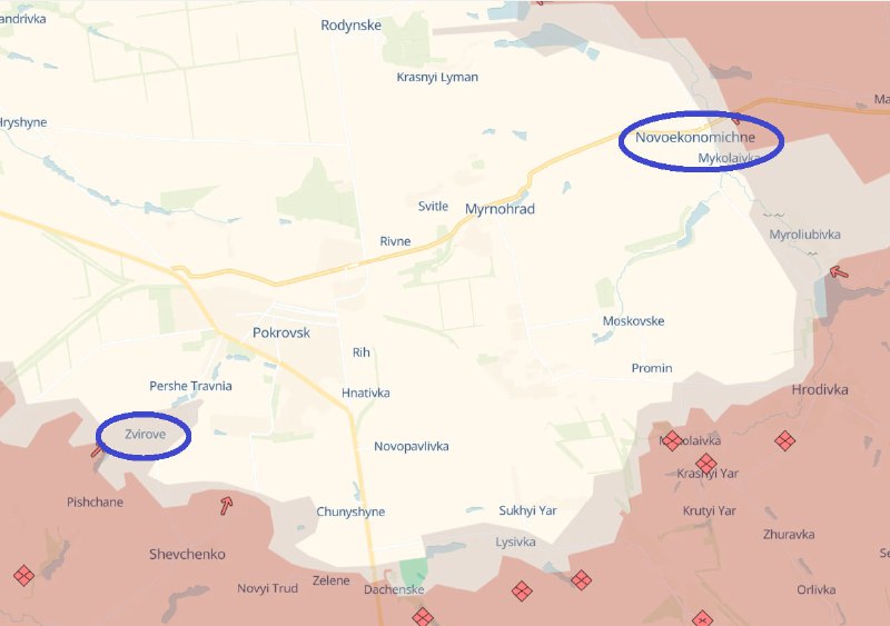 Новоекономічне знаходиться на східних підступах до Мирнограду, а Звєрєво – на південний захід від Покровська. На карті Deep State обидва населені пункти знаходяться в сірій зоні.