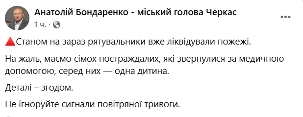 08:10 Вночі росіяни завдали ракетного удару по Черкасам. Семеро постраждалих, які звернулися за медичною допомогою, у тому числі одна дитина, повідомляє мер міста Анатолій Бондаренко.