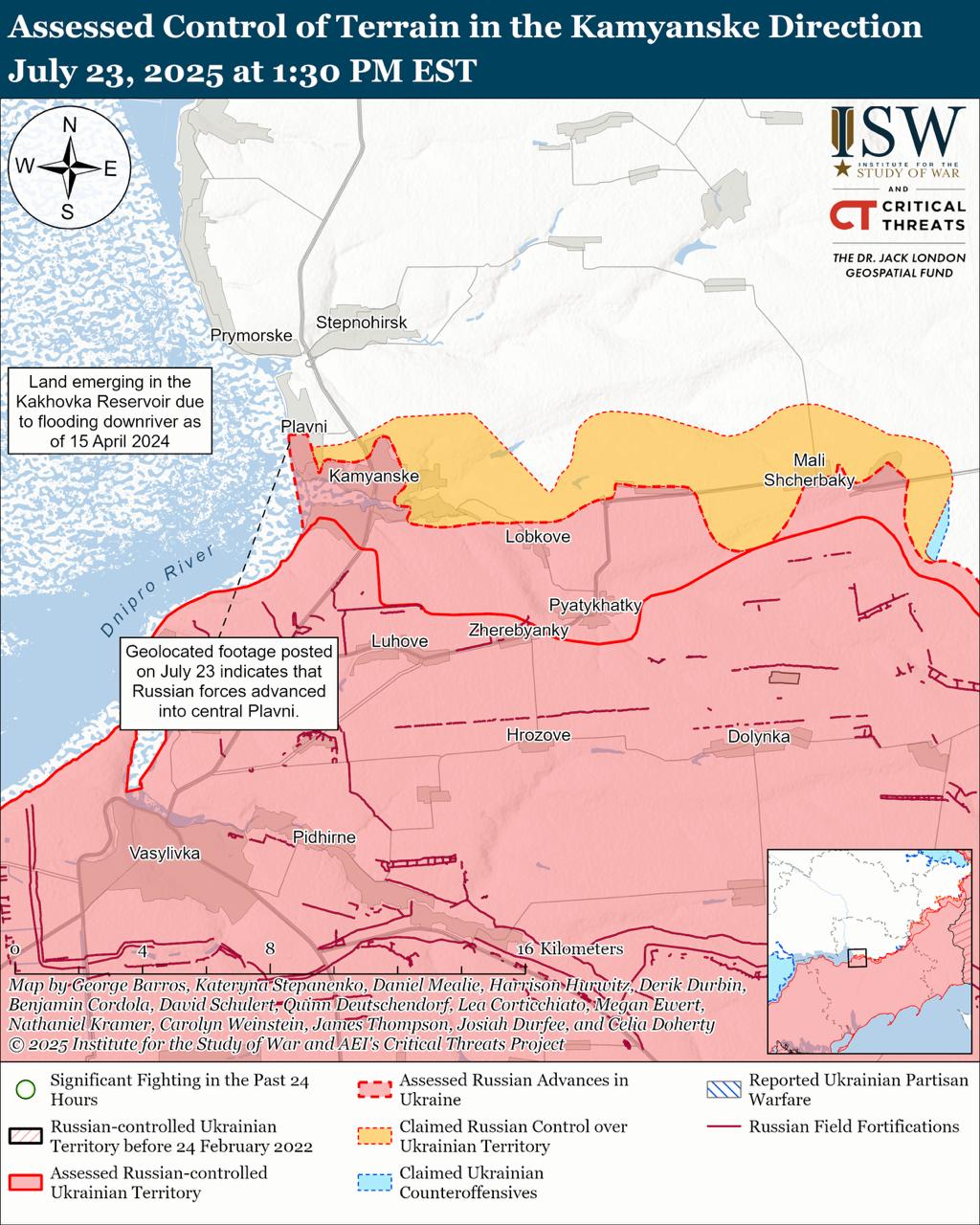 Американський "Інститут вивчення війни" вчора повідомляв про просування росіян у центрі Плавнів, що на північний захід від Кам'янського, а також атаки у напрямку Степногорська.