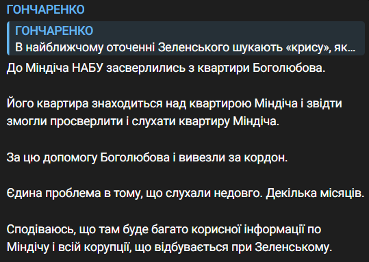 НАБУ близько трьох місяців прослуховувало квартиру Міндіча, в якій міг бути записаний і Зеленський через квартиру Боголюбова. За допомогу у цій справі співробітники НАБУ потім допомогли Боголюбову виїхати за кордон, повідомляє нардеп Олексій Гончаренко.