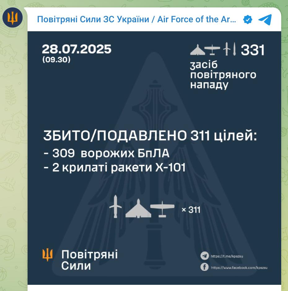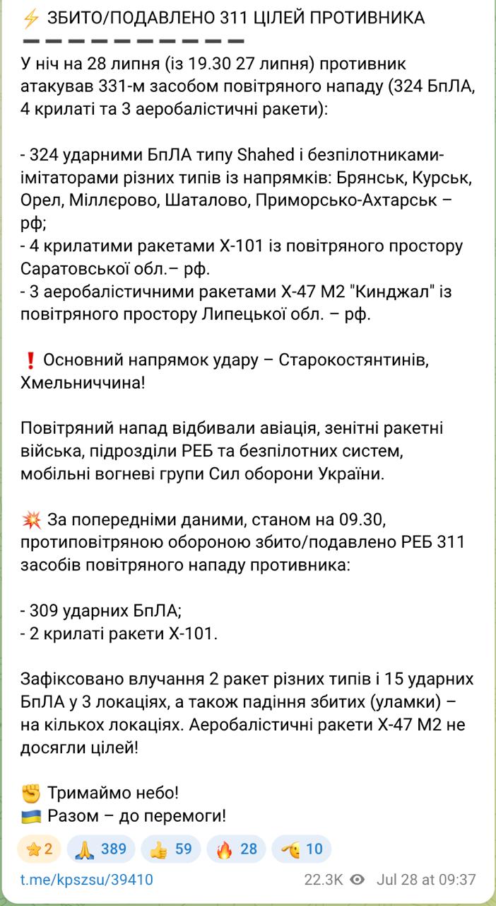 Збити вдалося придушити 309 дронів (Шахеди та імітатори) з 324, дві ракети Х-101 з чотирьох. Не вдалося збити всі 3 "Кинджали", але заявлено, що вони "не досягли цілей".