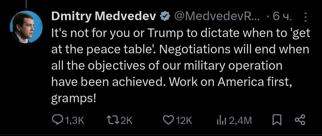 "Переговори завершаться, коли всіх цілей нашої військової операції буде досягнуто. Займіться Америкою перш за все, дідусю!" - Написав заступник глави Радбезу РФ.