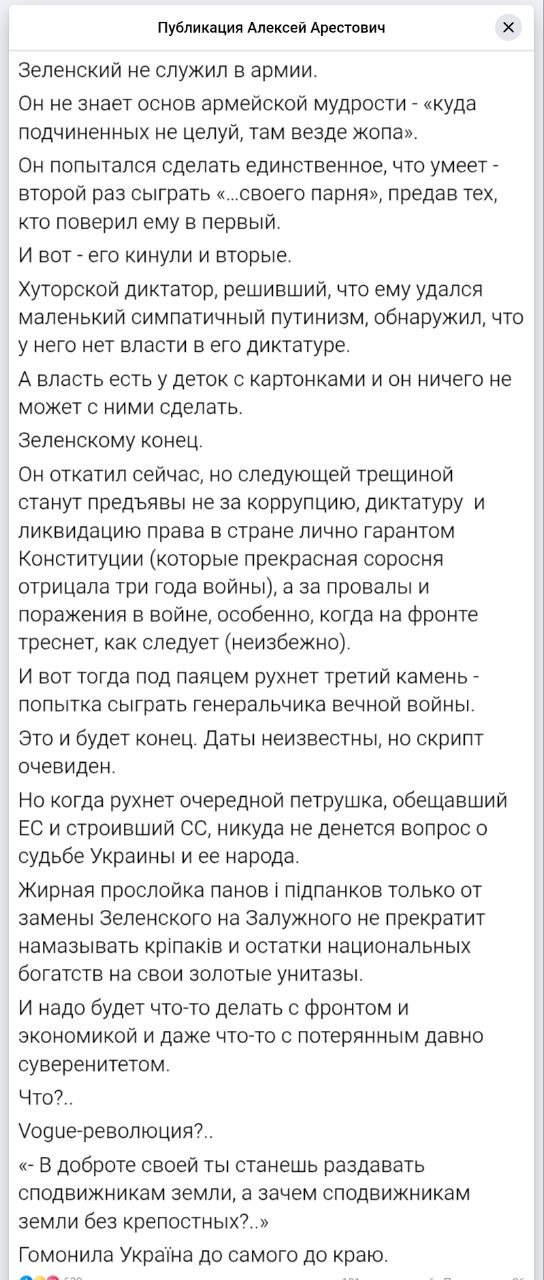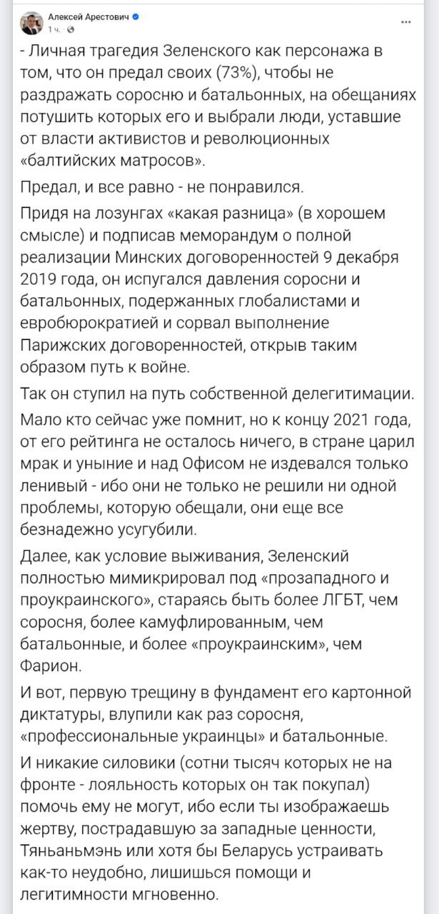 "Він відкотив зараз (повернувши повноваження НАБУ - Ред. ), але наступною тріщиною стануть пред'явлені не за корупцію, диктатуру і ліквідацію права в країні особисто гарантом Конституції (які прекрасна соросня заперечувала три роки війни), а за провали і поразки у війні, особливо коли на фронті трісне як слід (неминуче). І ось тоді під паяцем звалиться третій камінь - спроба зіграти генеральчика вічної війни. Це буде кінець. Дати невідомі, але скрипт очевидний", - пророкував Арестович.