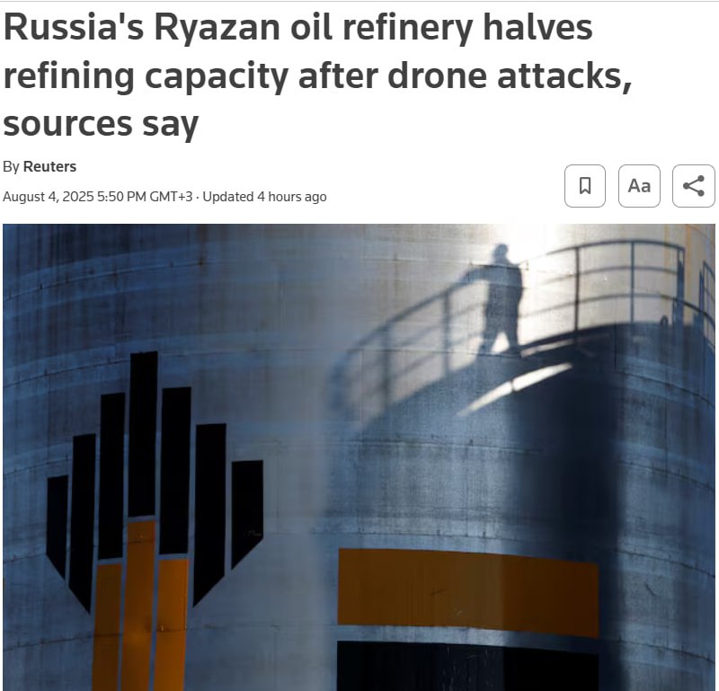 За даними агентства, після атаки українських дронів у ніч на 2 серпня нафтопереробний завод "Роснефти" в Новокуйбишевську Самарської області припинив роботу, а в Рязані - скоротив потужність удвічі.