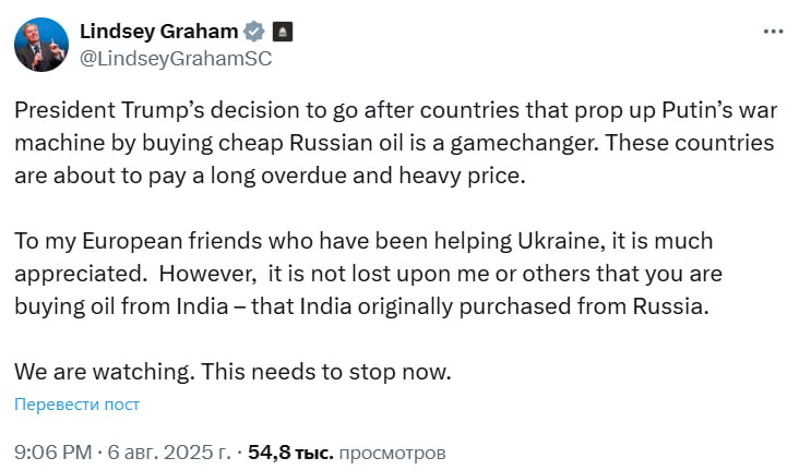 "Рішення президента Трампа атакувати країни, які підтримують військову машину Путіна, купуючи дешеву російську нафту, змінює правила гри. Цим країнам належить заплатити давно назрілу і високу ціну. Мої європейські друзі, які допомагають Україні, дуже вдячні. Однак ні я, ні інші не втрачають на увазі, що ви не купуєте, що ви купуєте. Ми спостерігаємо. Це потрібно припинити негайно", – заявив сенатор.