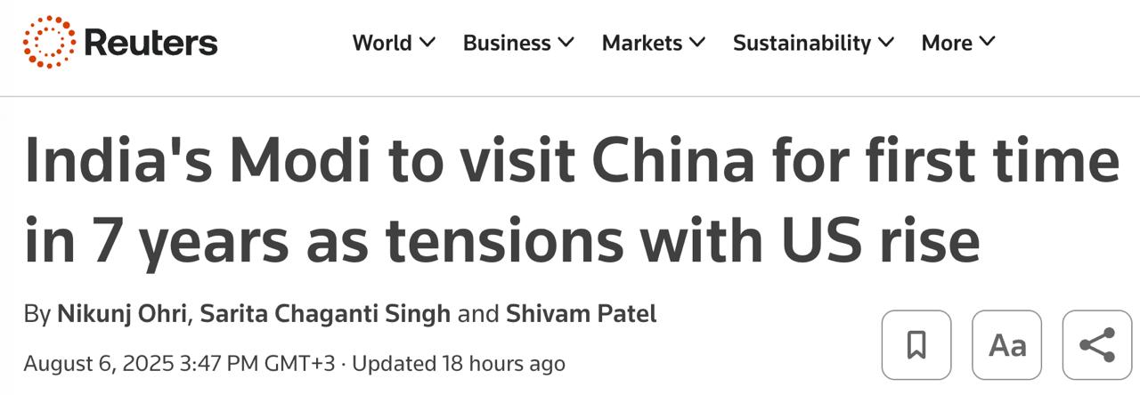 Прем'єр-міністр Індії Нарендра Моді вперше за сім років відвідає Китай. Це відбудеться після введення президентом США Дональдом Трампом мит за покупку Індією російської нафти. Візит заплановано на кінець серпня.