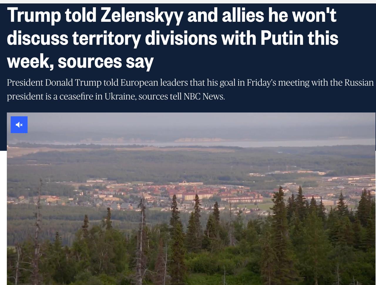 За даними NBC News, Трамп повідомив європейцям, що він не має наміру обговорювати розділи території з Путіним на Алясці. Джерела кажуть, що президент США наполягатиме на припиненні вогню.