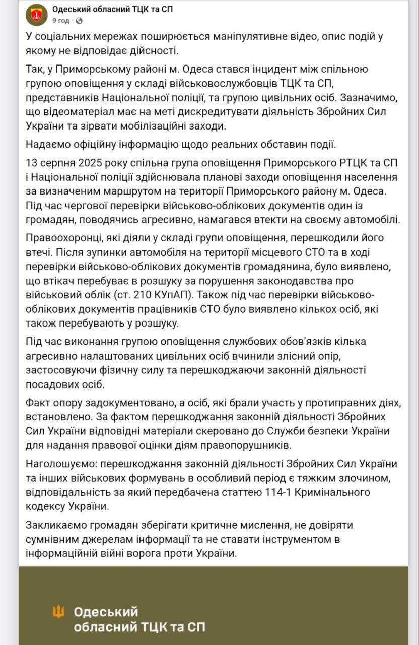 Тим часом Одеський обласний ТЦК у своєму коментарі звинуватив в інциденті цивільних, які чинили "злісний опір".