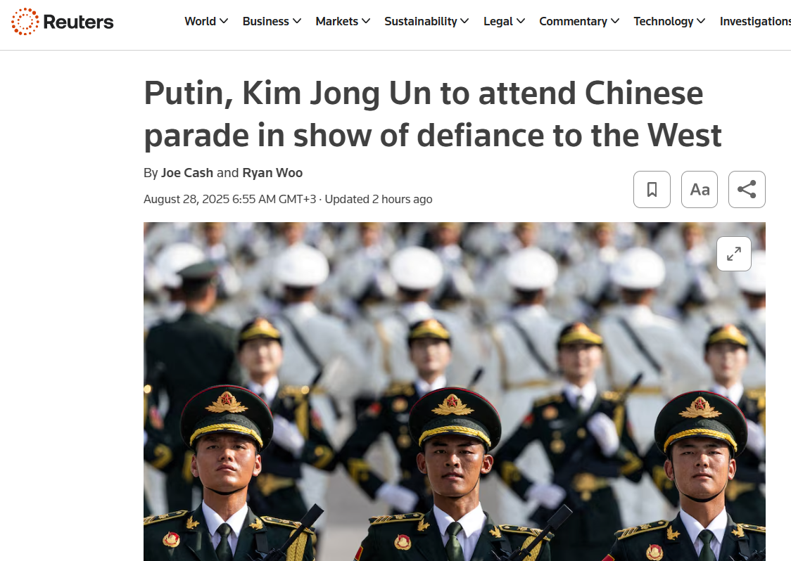 "На тлі зростаючої військової могутності Китаю під час параду на честь Дня Перемоги 3 вересня три лідери продемонструють серйозну солідарність не тільки між Китаєм і світовим Півднем, але і з Росією, що перебувають під санкціями, і Північною Кореєю", - пише видання.