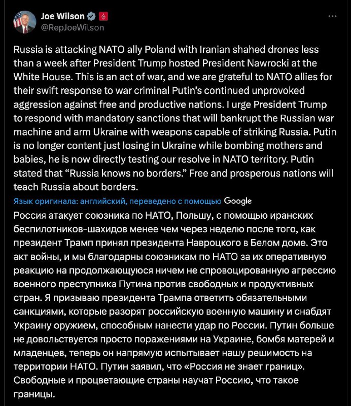 "Росія атакує союзника по НАТО, Польщу, за допомогою іранських безпілотників "Шахед" менш ніж через тиждень після того, як президент Трамп прийняв президента Навроцького у Білому домі. Це акт війни", - вважає Вілсон.