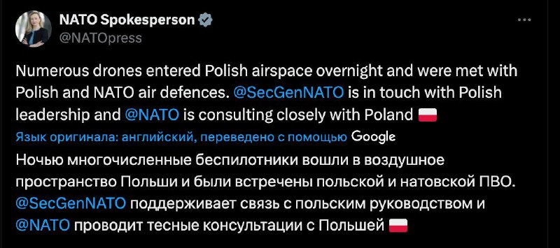 "Вночі численні безпілотники увійшли в повітряний простір Польщі і були зустрінуті польською та натовською ППО. Генеральний секретар підтримує зв'язок з польським керівництвом, НАТО проводить тісні консультації з Польщею", - заявила представниця Альянсу в Х.