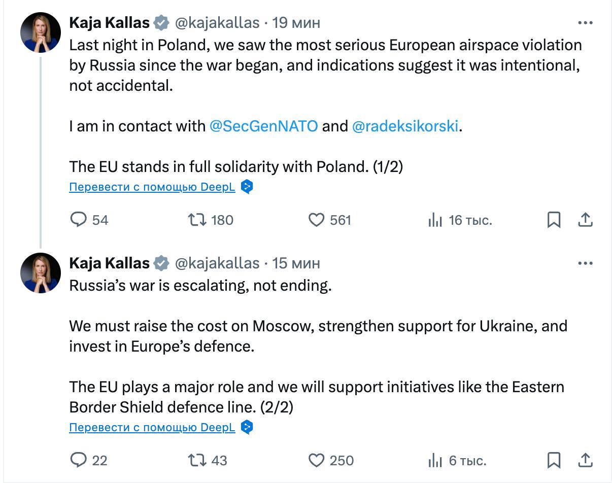 "Вчора ввечері в Польщі ми стали свідками найсерйознішого порушення Росією європейського повітряного простору з початку війни, і є підстави вважати, що це було навмисне, а не випадкове порушення. Війна Росії загострюється, а не закінчується. Ми повинні збільшити ціну для Москви, посилити підтримку України та інвестувати в оборону Європи", - сказано у публікації Каллас.