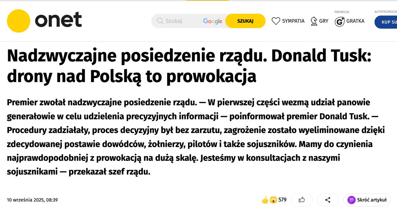 "Це перший випадок знищення російських безпілотників над територією країни НАТО. Всі наші союзники ставляться до ситуації дуже серйозно. Ми не зафіксували жодних втрат. Пошуки уламків збитих безпілотників продовжуються. Процедури були відпрацьовані, процес прийняття рішень був бездоганним, і загроза була усунена завдяки рішучим, і загроза була усунена завдяки рішучим. загалом, ми маємо справу з масштабною провокацією. Ми консультуємося з нашими союзниками", - передає польське видання Onet слова прем'єра.