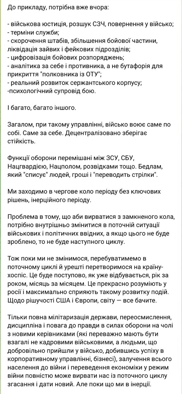 "Ми заходимо в чергове коло без ключових рішень, інерційного періоду. Проблема в тому, щоб вирватися із замкнутого кола, потрібно внутрішньо змінитися в поточній ситуації військових і політичних вступних, а якщо цього не буде зроблено, то не буде наступного циклу. Так що поки ми не змінимося, будемо перебувати в поточному циклі. поступово, як відбувається рік за роком, місяць за місяцем. Це чудово розуміють у Росії і максимально сприяють такому розвитку подій.