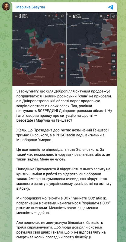 Народний депутат Мар'яна Безуглая заявила, що росіяни просуваються в Дніпропетровській області та під Добропіллем Донецької області. Також вона звинуватила командування ЗСУ у неправдивій інформації та вкотре закликала готуватися до блекауту.
