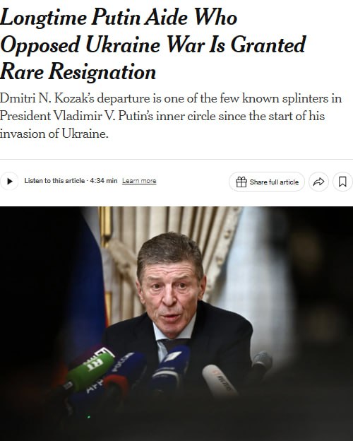 На думку видання, відхід Дмитра Козака – один із небагатьох відомих проявів розколу у найближчому оточенні президента Володимира Путіна з моменту початку конфлікту.