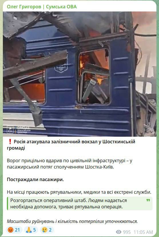 Дрони атакували залізничний вокзал у Шостці Сумської області. Внаслідок події постраждав пасажирський потяг.