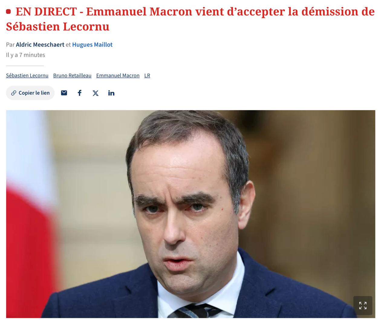 Призначений 9 вересня главою французького уряду Себастьєн Лекорню подав прохання про відставку, а президент країни Емманюель Макрон його ухвалив.