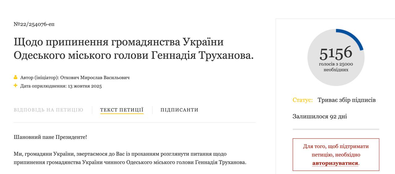Після того, як ЗМІ повідомили про підготовку на Банковій указу про позбавлення українського громадянства мера Одеси Геннадія Труханова, на сайті офісу президента з'явилася петиція з аналогічною пропозицією.