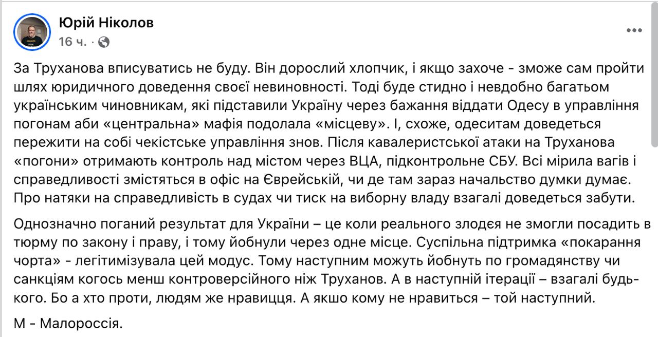 "Українські чиновники підставили Україну через бажання віддати Одесу в управління погонам, щоб центральна мафія перемогла місцеву. І, схоже, одеситам доведеться знову пережити чекістське управління. Після кавалерійської атаки на Труханова погони отримають контроль над містом через ВГА - підконтрольну СБУ (Лисак – виходець із СБУ – Ред.). Про натяки на справедливість у судах чи тиск на виборну владу взагалі доведеться забути. Однозначно поганий результат для України – це коли реального лиходія не змогли ув'язнити за законом і правом, і тому е@нули через одне місце. Громадська підтримка покарання риса легітимізувала цей модус. Тому далі можуть е@нути за громадянством чи санкціями когось менш контроверсійного, ніж Труханов. А в наступній ітерації – взагалі будь-кого. Тому що хтось проти, людям же подобається. А якщо комусь не подобається – той наступний. М - Малоросія", - написав Ніколов.