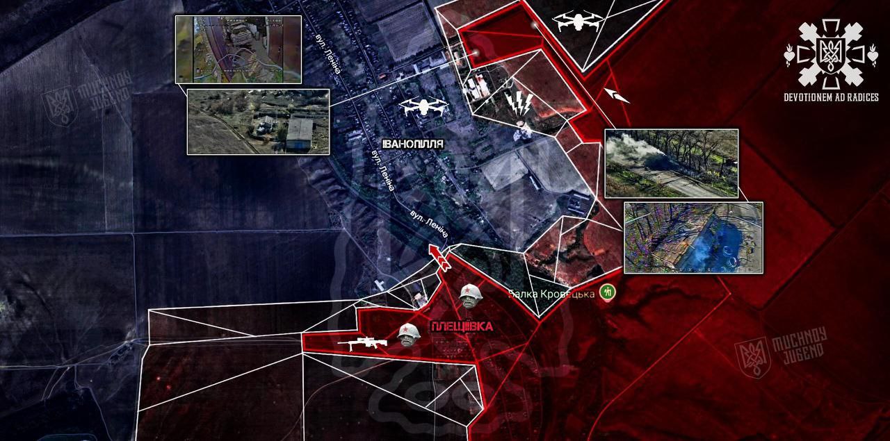 Боєць ЗСУ "Мучний" у свою чергу звертає увагу на події на південь від міста. Там, за його інформацією, вже практично повністю захоплена Плещеївка (за даними Deep State, це село ще під контролем України) та розвивається наступ на сусіднє Іванопілля – за яким починається південна околиця Костянтинівки.