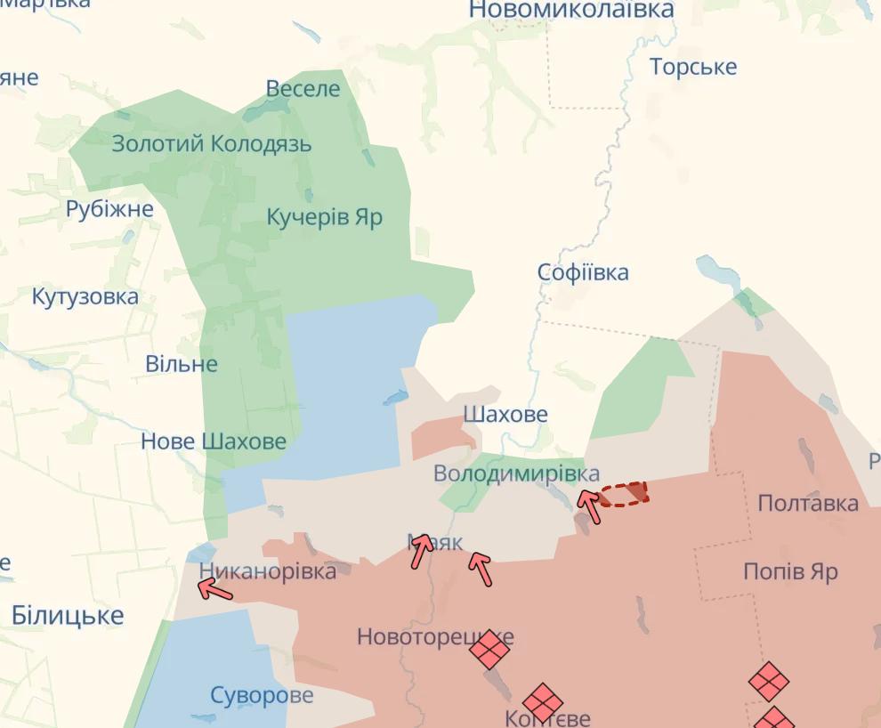 10:52 Армія РФ просунулась біля Вовчанська та Володимирівки, що на південь від добропольського виступу, повідомляє Deep State.