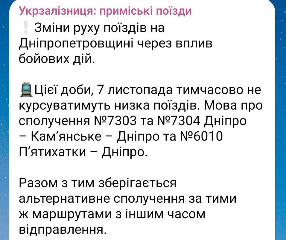 08:03 Через бойові дії "Укрзалізниця" змінила рух поїздів Дніпропетровщиною. 7 листопада тимчасово не курсуватимуть поїзди №7303 та №7304 Дніпро – Кам'янське – Дніпро та №6010 П'ятихатки – Дніпро.