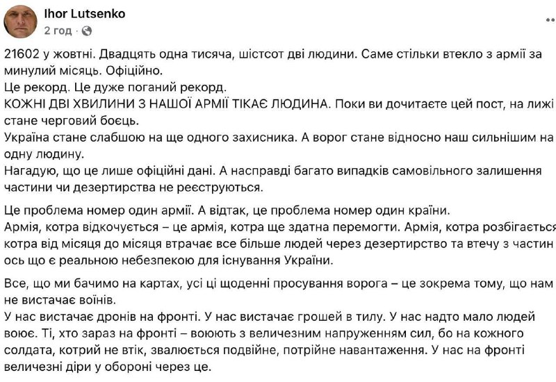 "Кожні дві хвилини з нашої армії біжить людина. Це тільки офіційні дані. А насправді багато випадків самовільного відходу з частини або дезертирства не реєструють. Це проблема номер один в армії. Армія, що відкочується, - це армія, яка ще здатна перемогти. небезпека для існування України", - пише Луценко.