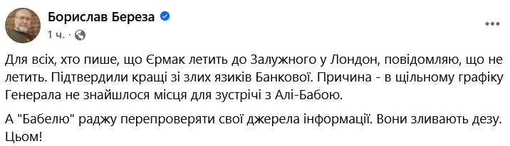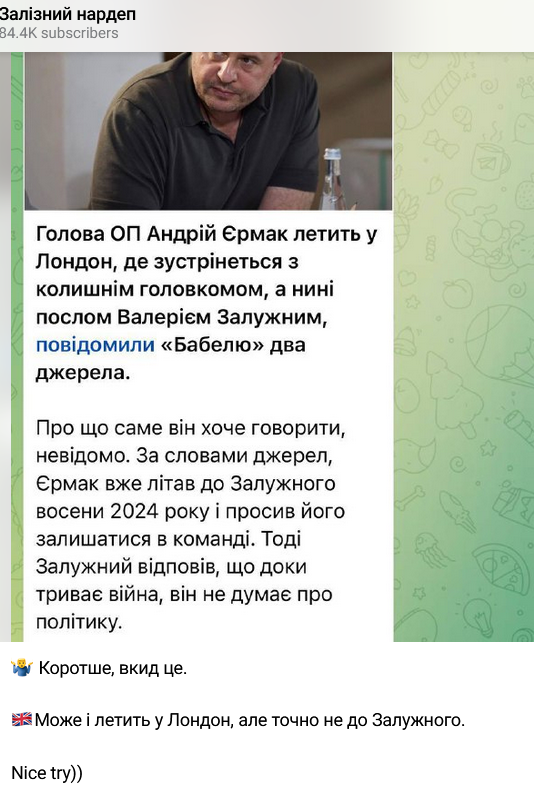 Водночас нардеп Ярослав Железняк ("Голос") спростував інформацію видання про те, що Єрмак летить до Лондона до екс-головного Залужного.
