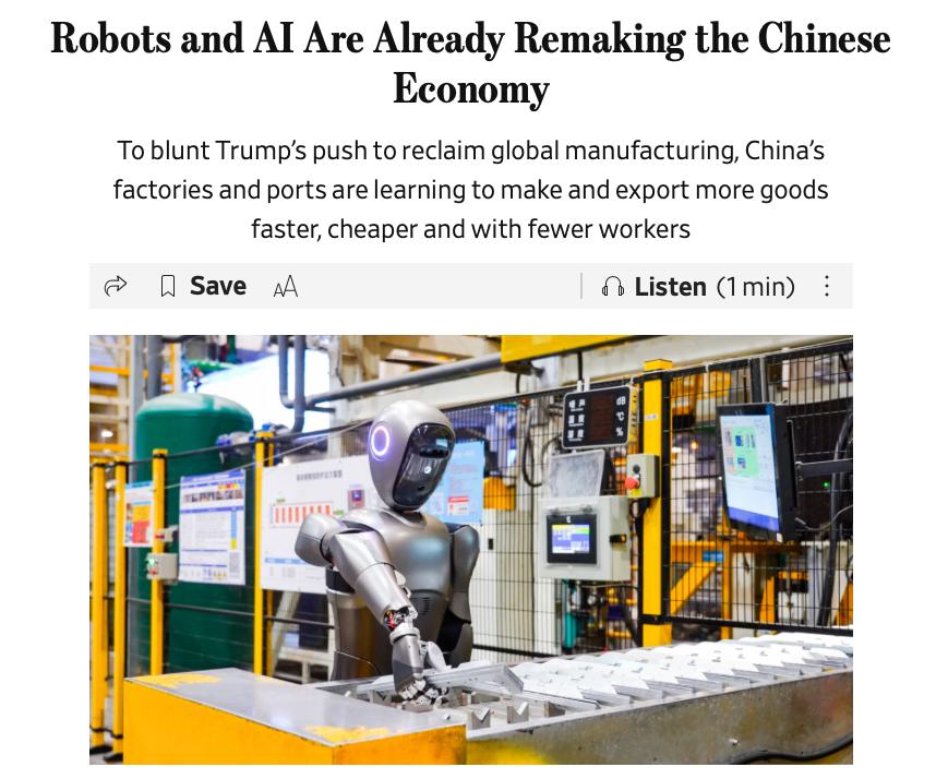 Така модель економіки дозволяє виробляти товари швидше, дешевше та з мінімальною участю людей. На підприємствах Midea операції, які раніше займали 15 хвилин, виконуються за 30 секунд. Заводи Baosteel переходять до формату темних фабрик, де робота триває цілодобово майже без втручання людини. У портах ШІ прискорює та оптимізує обробку вантажів. У Тяньцзіні планування операцій скоротилося з доби до десяти хвилин, а чисельність персоналу зменшилась майже на 60%. Масштабне впровадження таких систем допомагає Китаю компенсувати зростання зарплат, дефіцит робочих рук та зовнішній тиск на експорт.