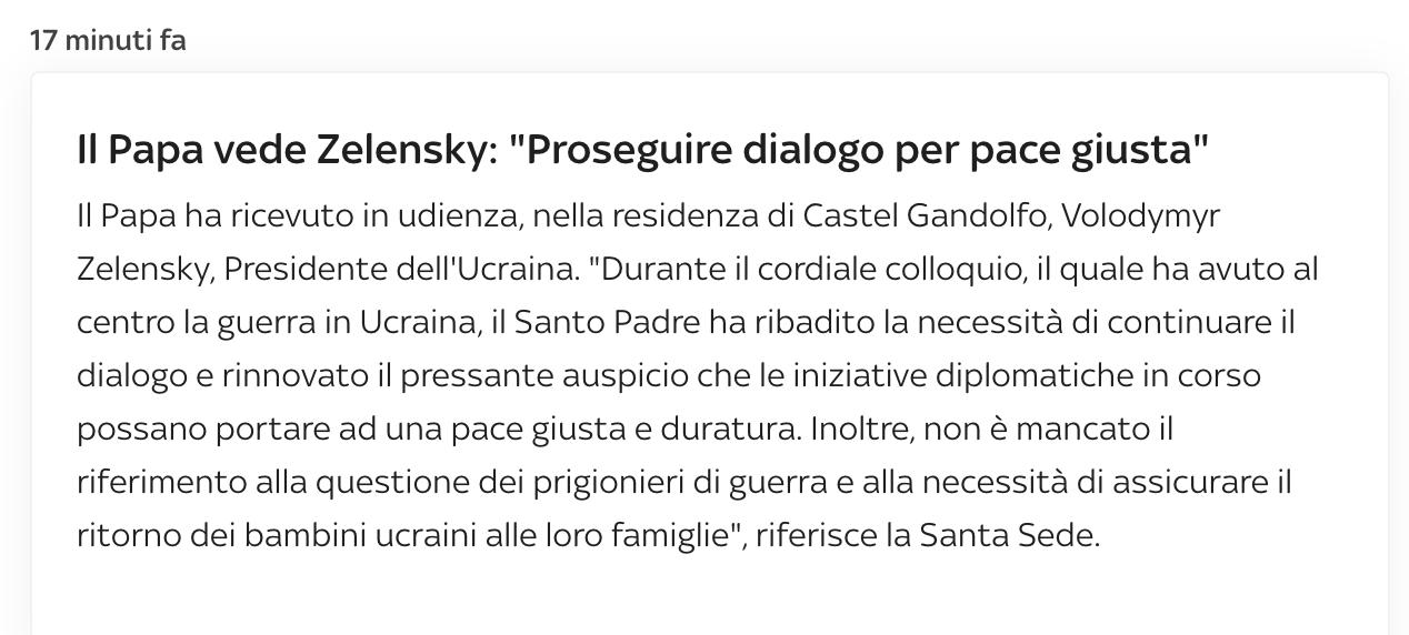 "Під час серцевої бесіди, присвяченої війні в Україні, святіший отець підтвердив необхідність продовження діалогу і знову висловив свою щиру надію на те, що дипломатичні ініціативи, що продовжуються, можуть призвести до справедливого і міцного світу. Крім того, він згадав питання військовополонених і необхідність забезпечити повернення українських дітей у свої сім'ї.