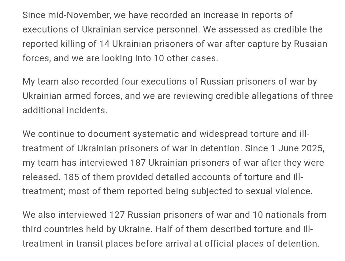 За оцінкою ООН, заслуговують на довіру дані про вбивство 14 українських військовополонених після їх захоплення російськими військами, ще 10 випадків перебувають у стадії розслідування.
