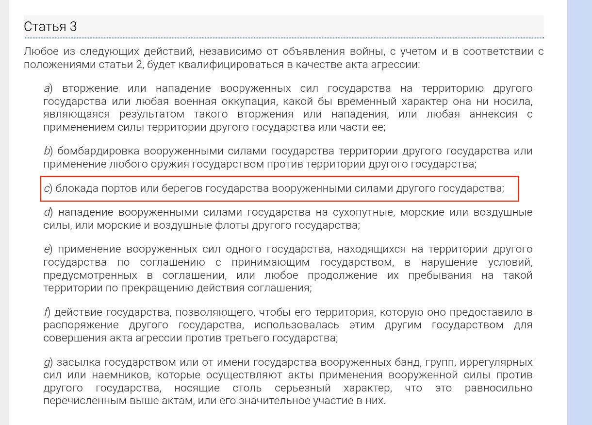 Втім, цей нюанс має не надто велике значення, оскільки ставлення до війни в Україні в різних країнах світу вже давно визначається не так нормами міжнародного права, як геополітичними та економічними інтересами. Набагато важливішим є інший аспект, а саме створення прецеденту морської блокади без санкції ООН, який може бути використаний і проти інших країн, насамперед Росії та Китаю.