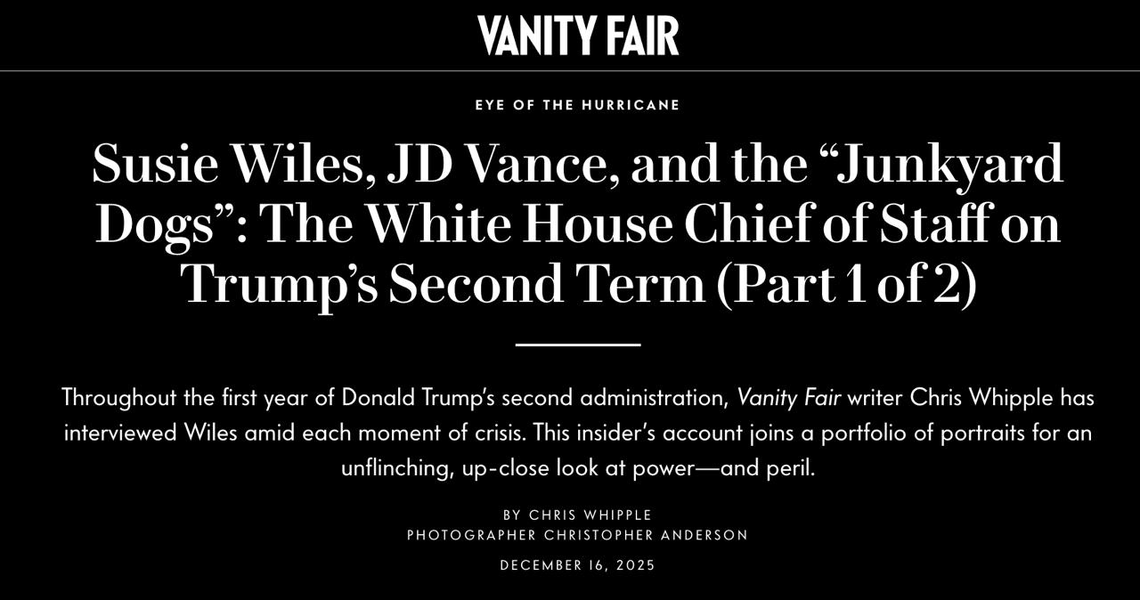 Уайлс протягом усього 2025 року розмовляла з журналістом Vanity Fair Крісом Уіпплом, і 16 грудня журнал випустив на основі цих розмов великий матеріал про адміністрацію Дональда Трампа.